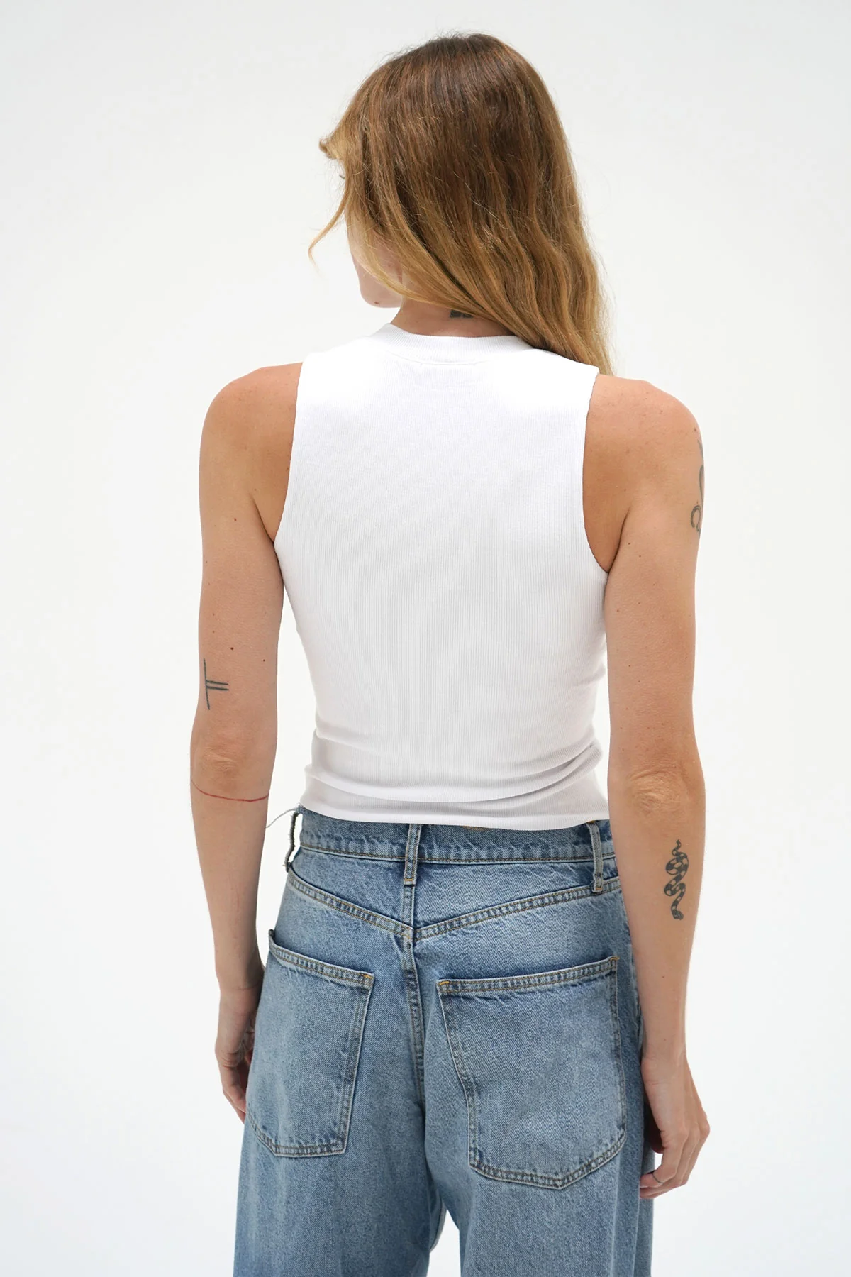Double layered in our 2x1 rib fabric, this sleeveless fits tight and smooth to the body. The crew neckline is higher and the hemline is meant to hit right at the top of your pant.